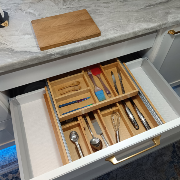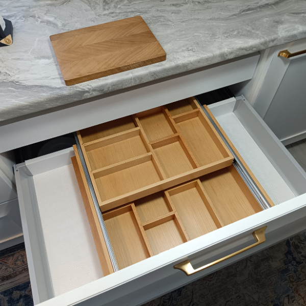 Çift katlı ahşap kaşıklık çekmecenizin tüm hacmini kullanmanız için ideal bir çözümdür. Çekmece içindeki lüzumsuz boşlukları en iyi şekilde değerlendirerek daha fazla ekipman saklamanızı sağlar.