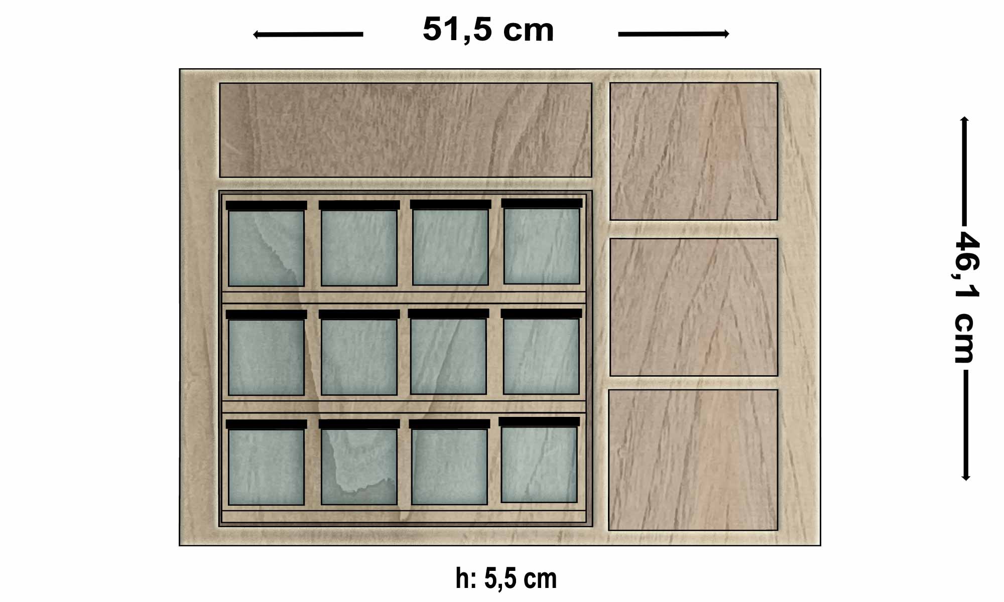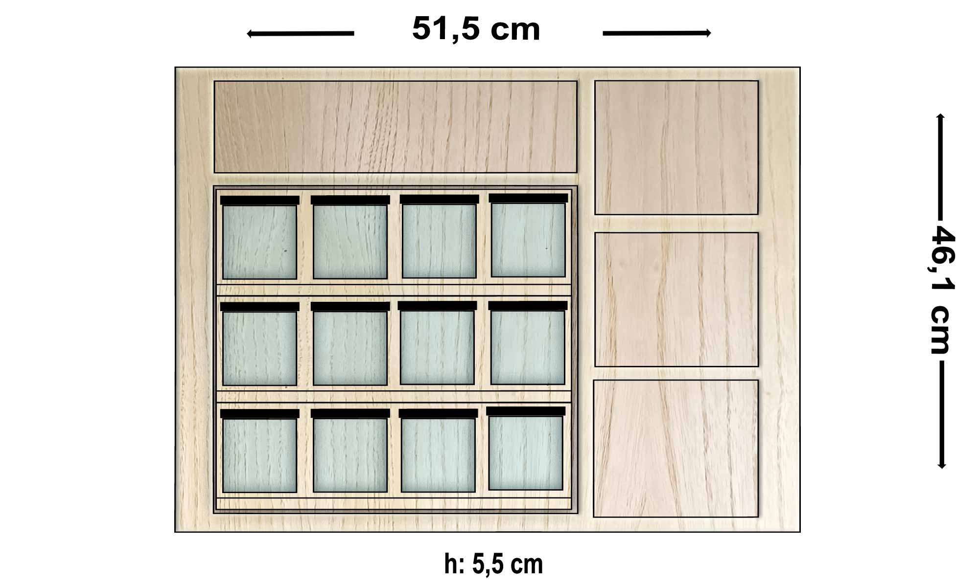 Dişbudak ağacından üretilmiş bu özel model, mutfağını hem düzenli hem de şık tutmak isteyen kullanıcılar için tasarlanmıştır. Kaşıklık içine entegre edilen yatık baharat platformu, çekmece içindeki baharat kavanozlarının görünürlüğünü artırır.