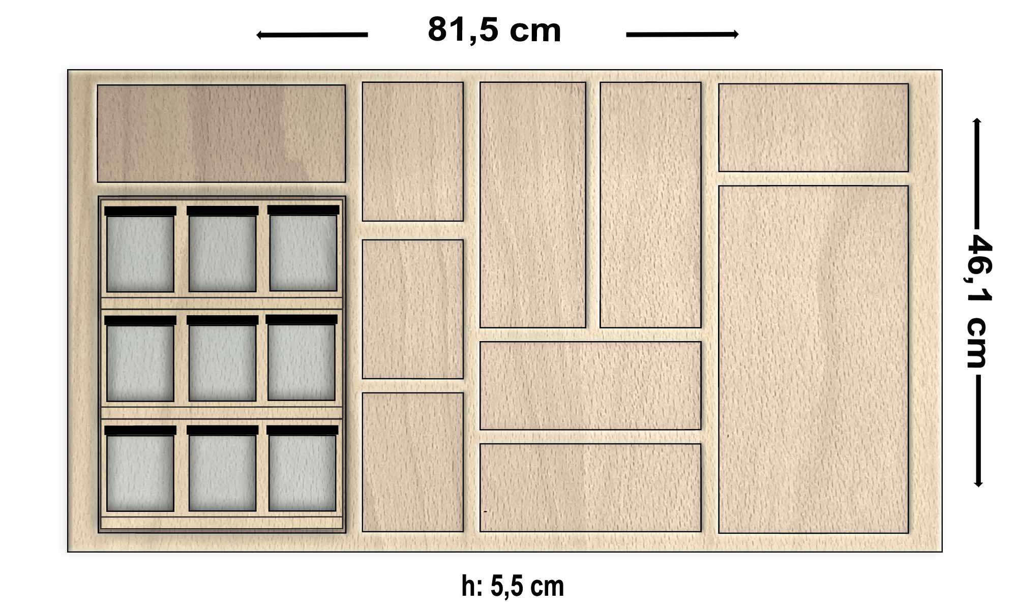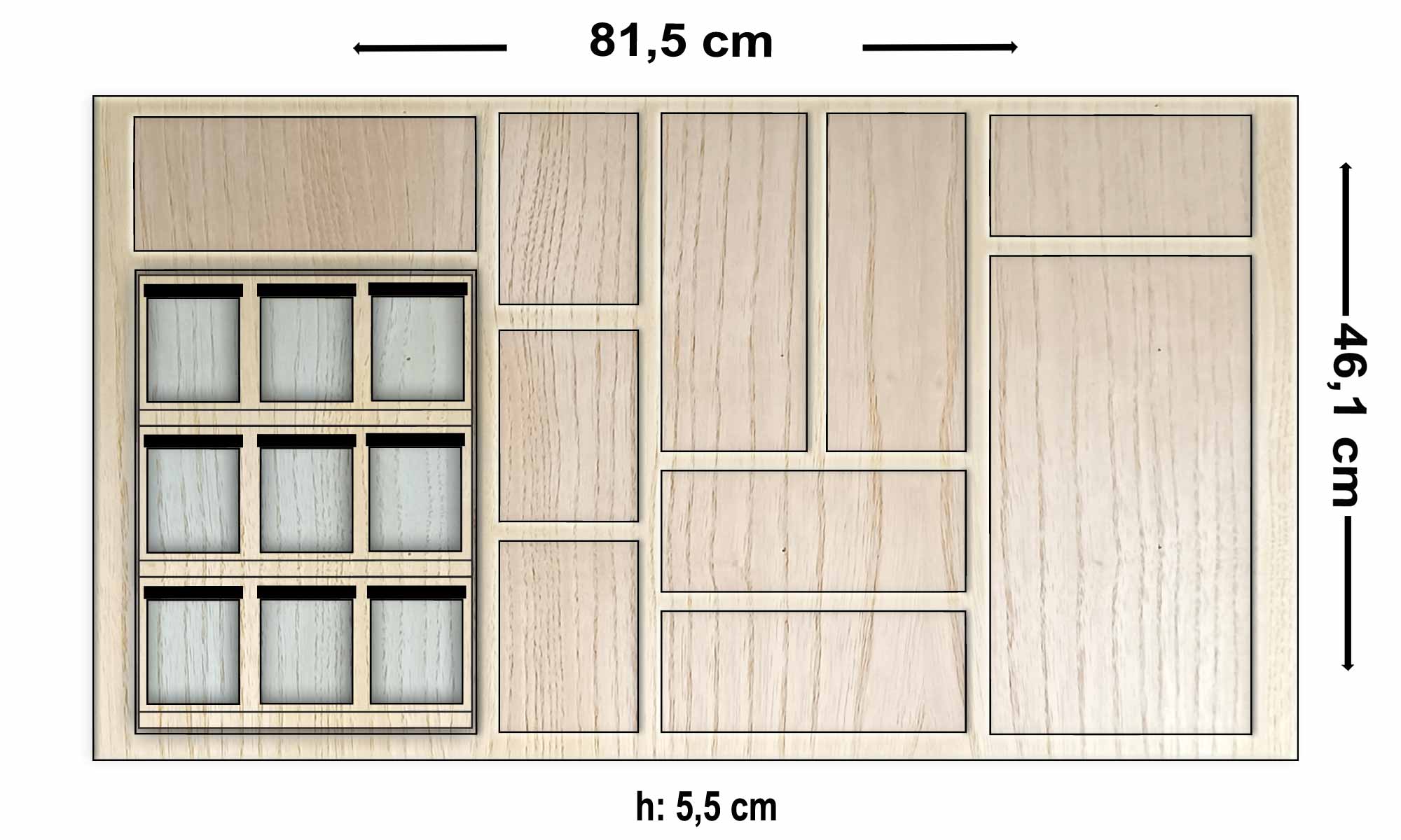 Dişbudak ağacından üretilmiş bu özel model, mutfağını hem düzenli hem de şık tutmak isteyen kullanıcılar için tasarlanmıştır. Kaşıklık içine entegre edilen yatık baharat platformu, çekmece içindeki baharat kavanozlarının görünürlüğünü artırır.