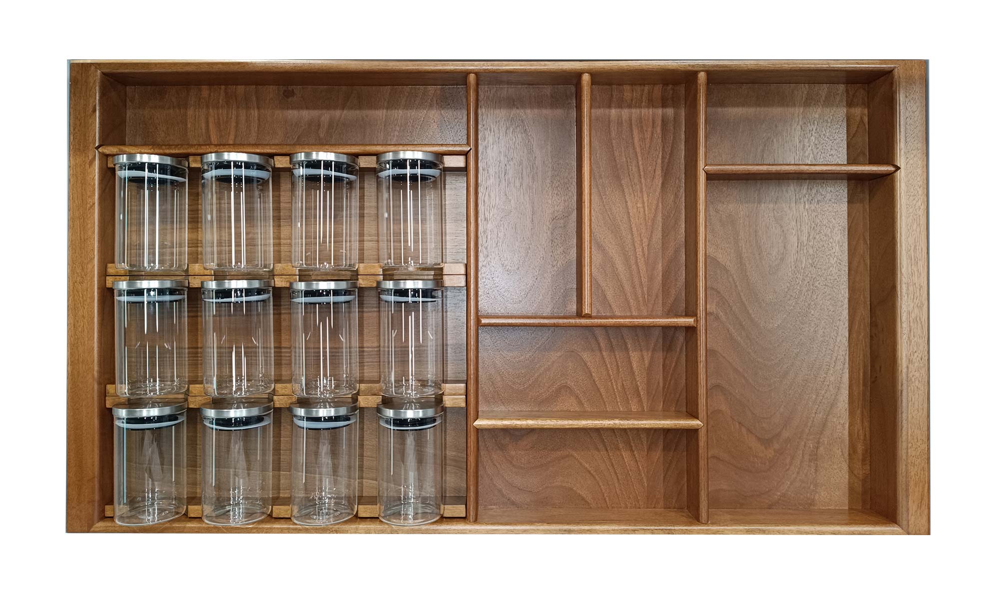 Ceviz ağacının estetik ve dayanıklı dokusunu, akılcı bir mutfak düzeniyle birleştiren bu özel model; çekmece içi kullanım için tasarlanmıştır. Yatık platform bölümü, kaşıklığın içine tam yerleşerek baharat kavanozlarınızı düzenli ve erişilebilir hale getirir.