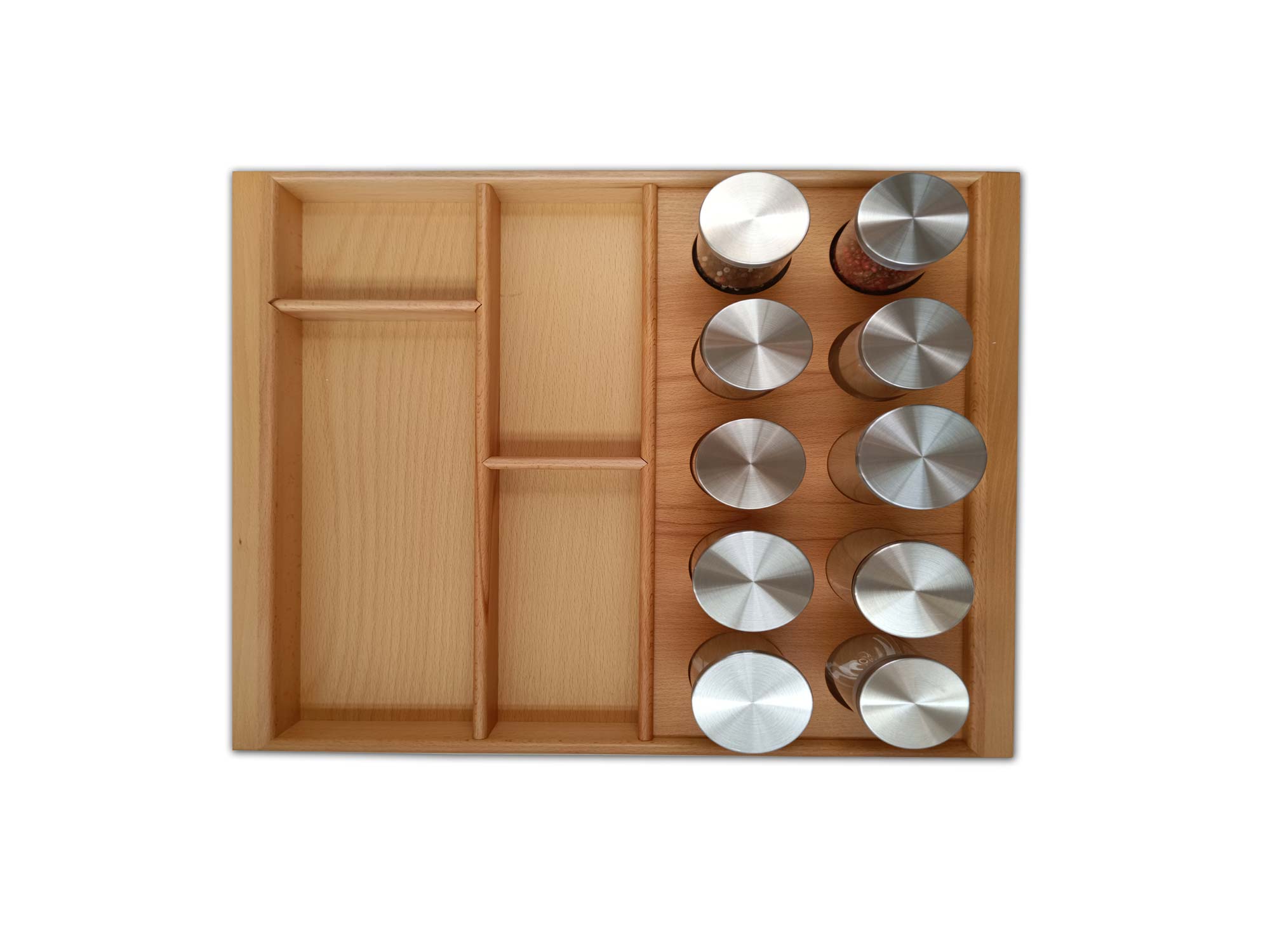 Ceviz ağacının estetik ve dayanıklı dokusunu, akılcı bir mutfak düzeniyle birleştiren bu özel model; çekmece içi kullanım için tasarlanmış, %100 el yapımı bir üründür. Platform, kaşıklığın içine sabitlenmiştir.