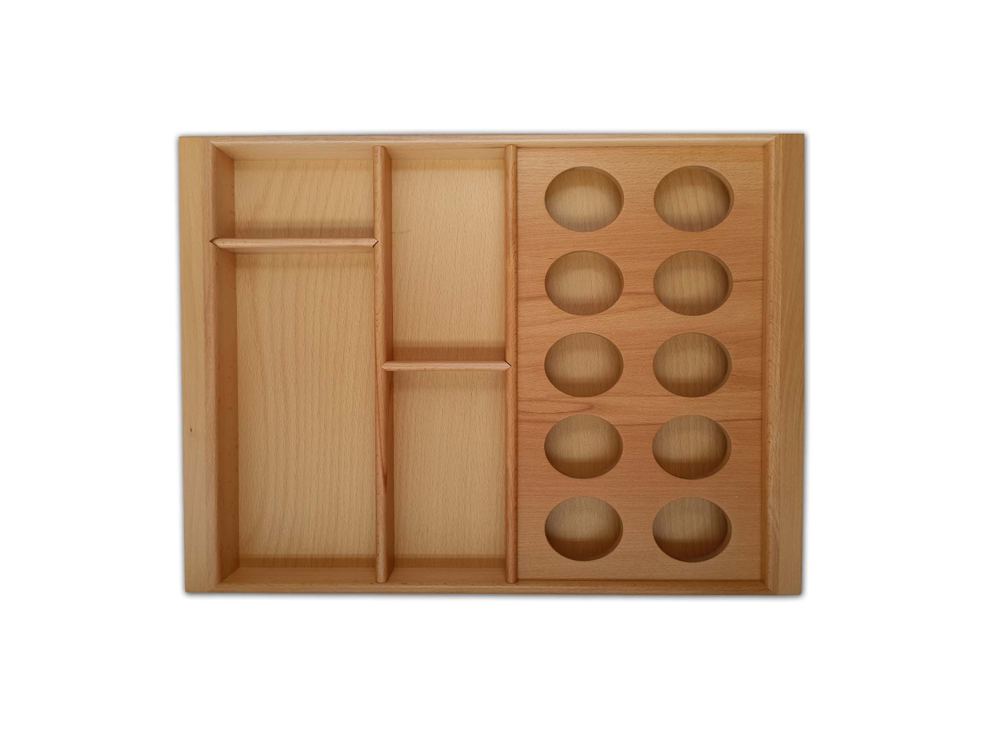 Kayın ağacının sade, açık tonları ve güçlü yapısıyla tasarlanan bu kaşıklık modeli, çekmece içi düzen arayan kullanıcılar için ideal bir seçimdir.