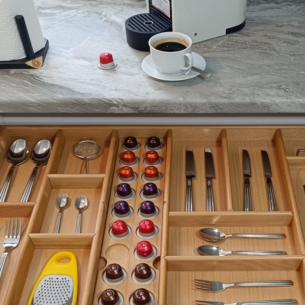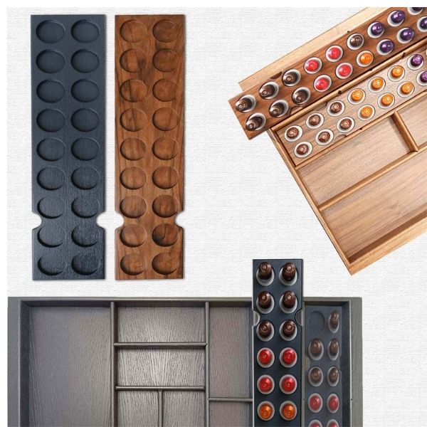 Kapsül kahve keyfinizi düzen ve şıklıkla buluşturun! Ahşap Nespresso Kapsül Standı, kahve kapsüllerinizi hem çekmece içinde hem de tezgah üstünde saklamanıza olanak tanıyan çok yönlü bir tasarıma sahiptir. Doğal ahşabın sıcak dokusuyla üretilen bu stand, hem fonksiyonel hem de estetik bir dokunuş sunar.