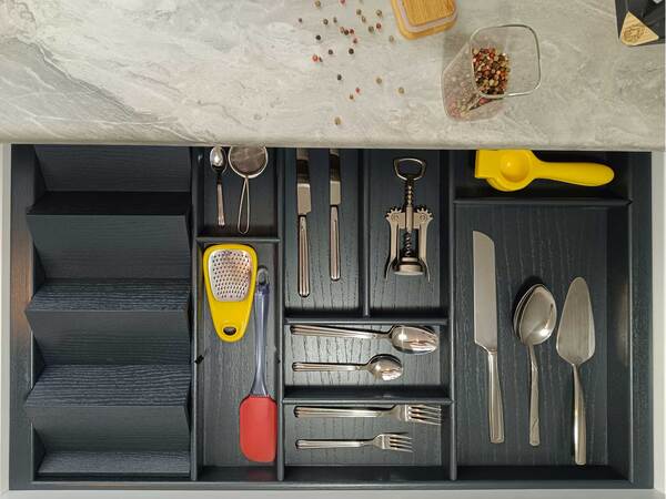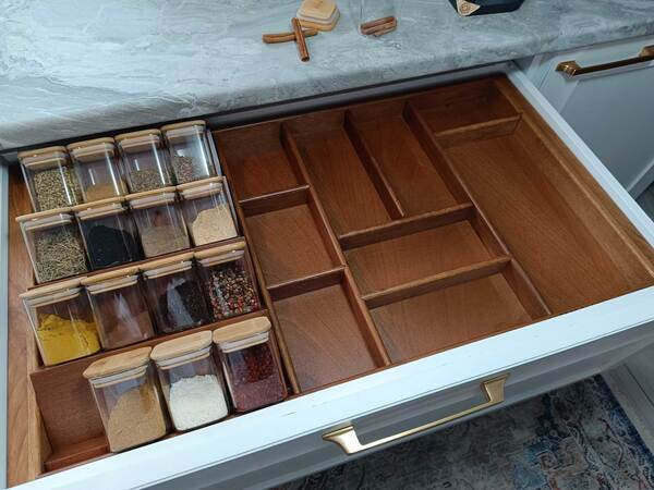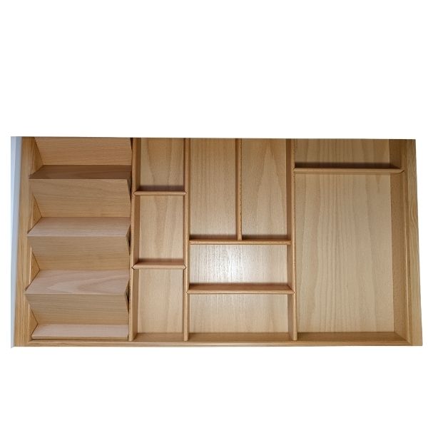 Dişbudak ağacından üretilmiş bu özel model, mutfağını hem düzenli hem de şık tutmak isteyen kullanıcılar için tasarlanmıştır. Kaşıklık içine entegre edilen merdiven platformu, çekmece içindeki baharat kavanozlarının görünürlüğünü artırır.