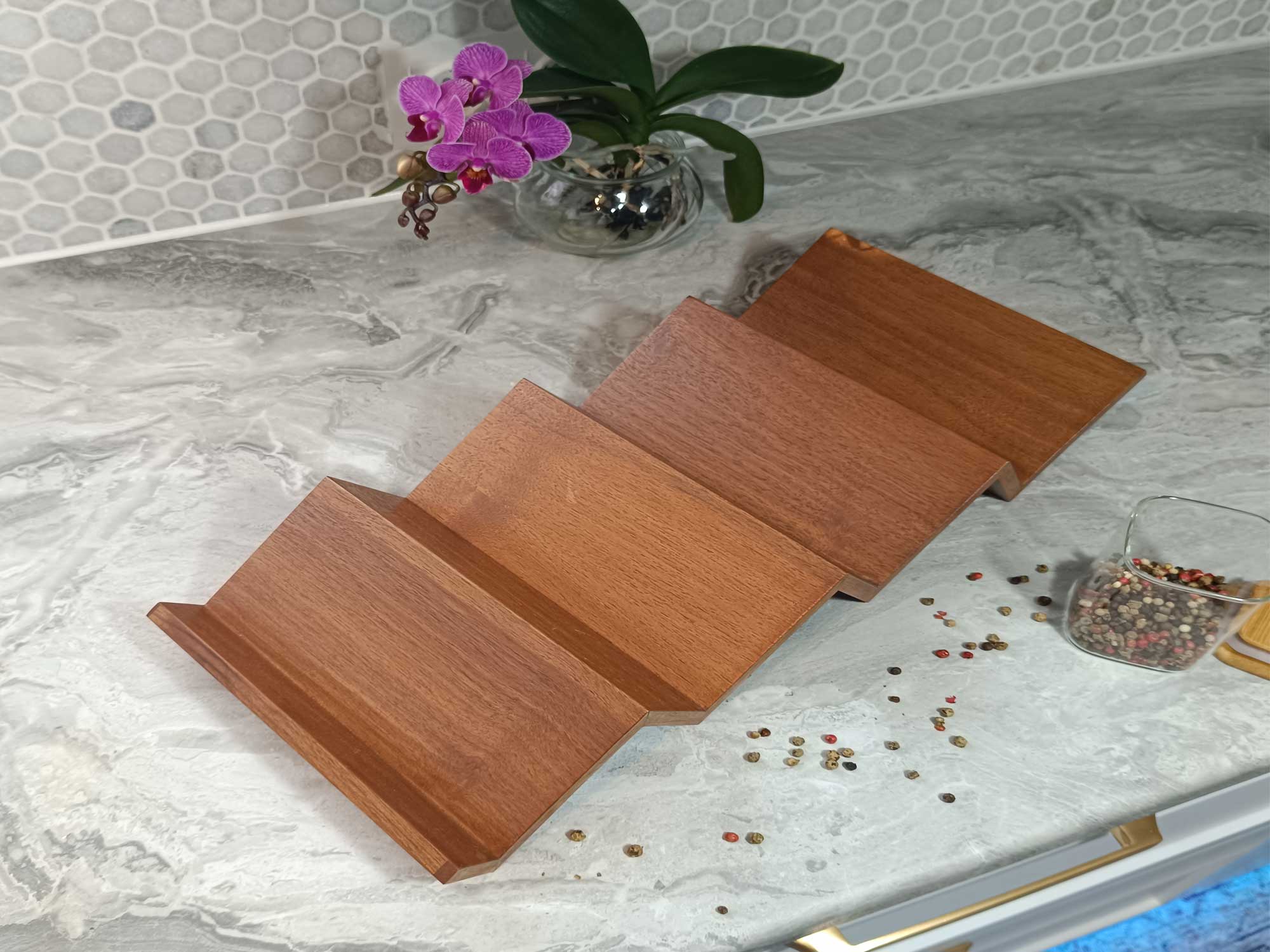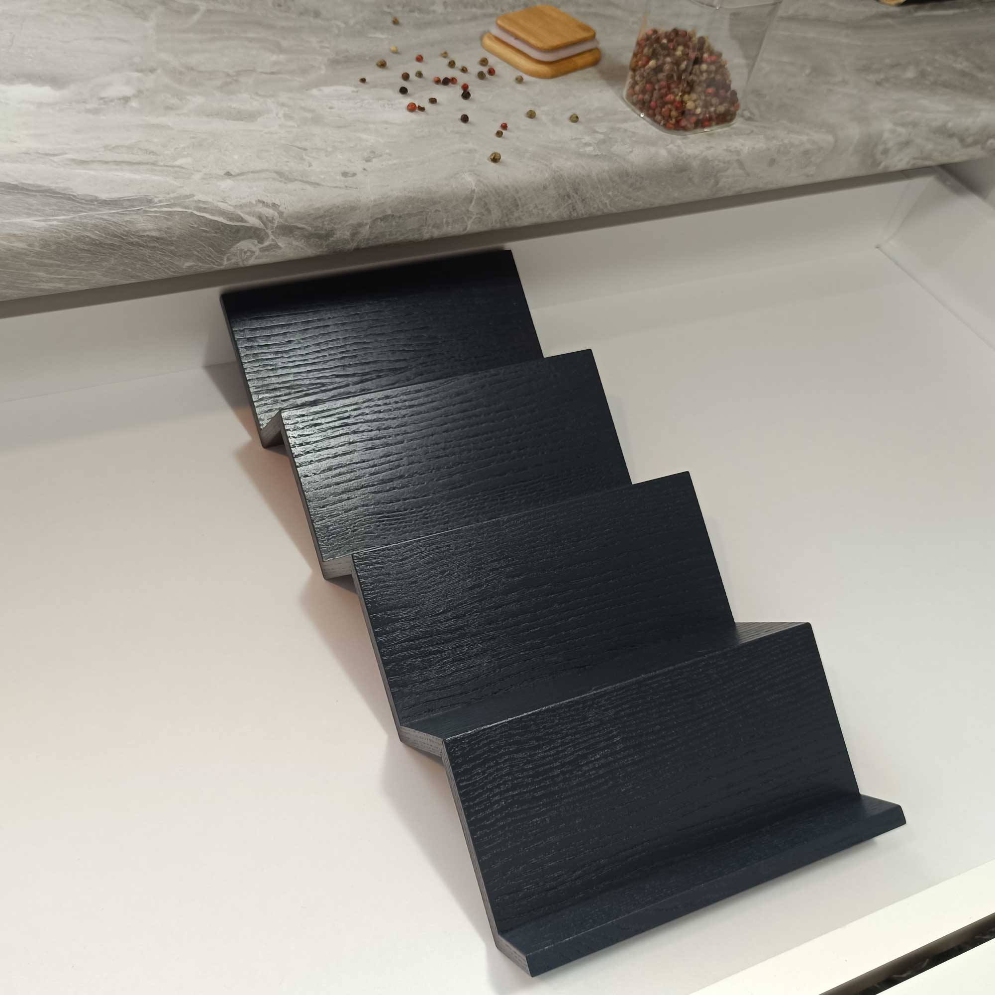 Modern mutfaklara hitap eden bu baharatlık, antrasit boyalı dişbudak ağacından üretilmiştir. Ağacın damarları özel bir teknikle belirginleştirilmiş ve antrasit boya ile şık bir kontrast yaratılmıştır. 12 adet baharat kapasiteli merdiven basamaklı platform tasarımı, fonksiyonel olduğu kadar dekoratif bir çözüm sunar.