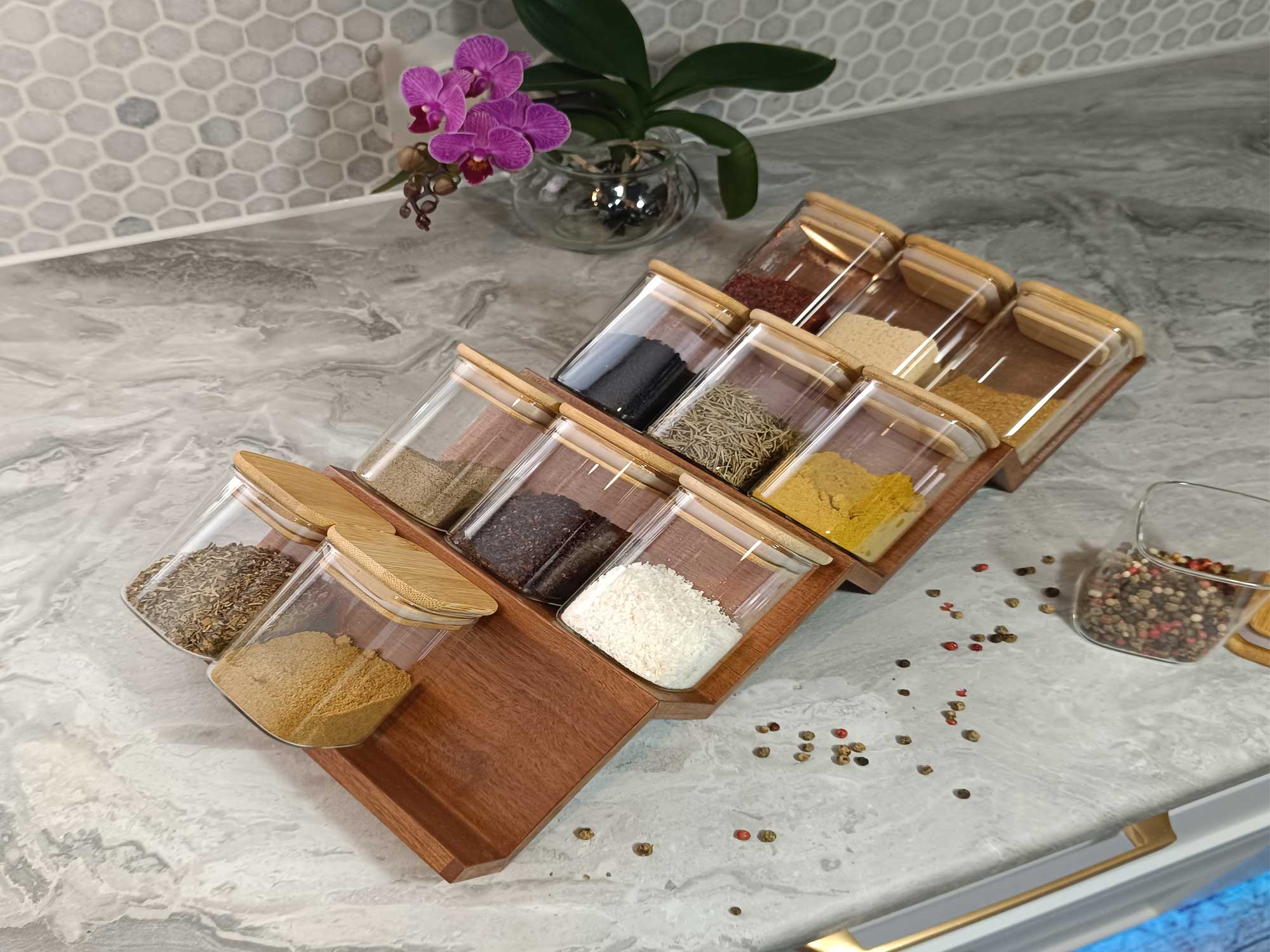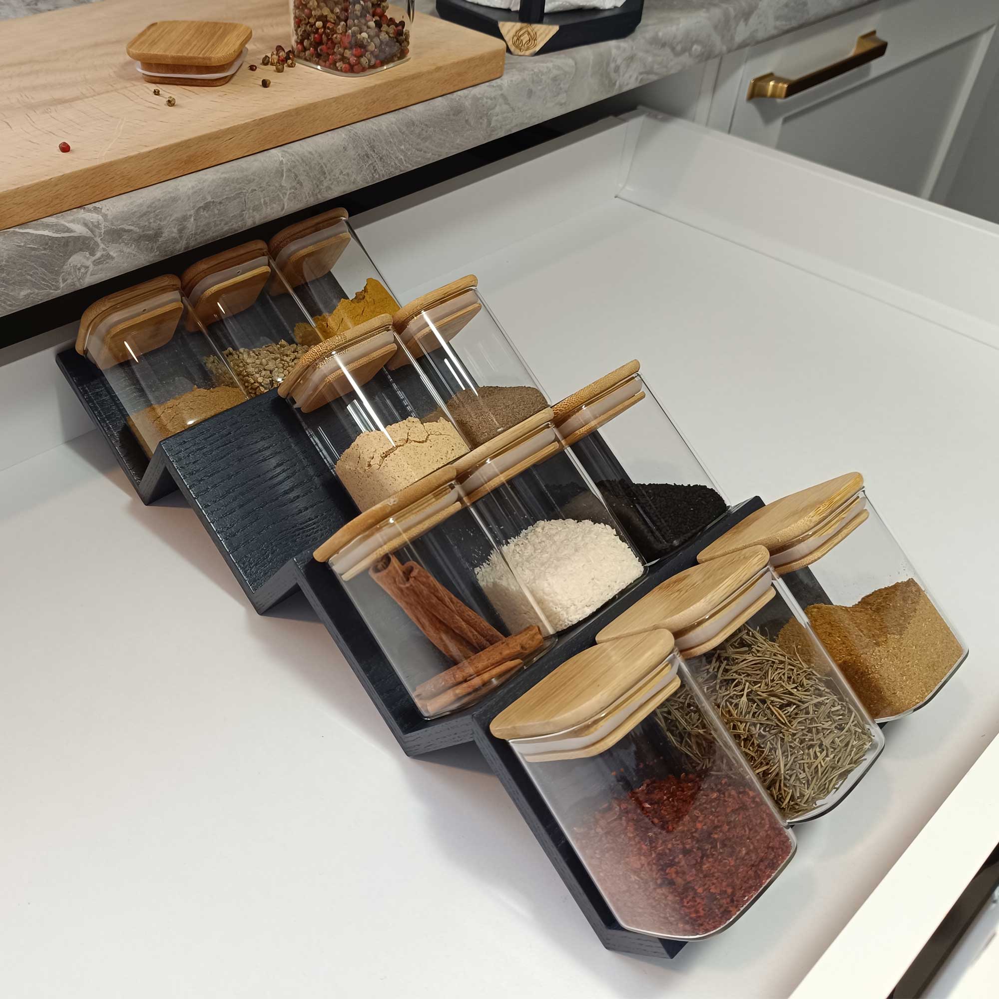 Ceviz ağacının estetik ve dayanıklı dokusunu, akılcı bir mutfak düzeniyle birleştiren bu özel baharatlık çekmece içi kullanım için tasarlandı. Merdiven platformu sayesinde baharat kavanozlarını düzenli bir şekilde sıralayabilir ve içeriklerini kolayca görebilirsiniz. 12 adet baharat kapasiteli merdiven basamaklı platform tasarımı, fonksiyonel olduğu kadar dekoratif bir çözüm sunar.