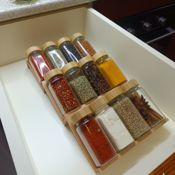 Merdiven basamaklı baharat modülü, baharat kavanozlarını kolayca düzenlemenizi ve aradığınızı hemen bulmanızı kolaylaştırır. Modüler tasarımı sayesinde, çekmecenizde ihtiyacınız olan sayıda kavanozu kullanabilirsiniz. Daha fazla baharat kavanozu isterseniz mevcut olana bir veya birkaç modül daha ekleyerek sayıyı artırabilirsiniz. Fonksiyonel olması düşünülerek daha önce satın almış olduğunuz çekmece kaşıklığın kepçelik bölümüne de uyacak şekilde tasarlanmıştır.