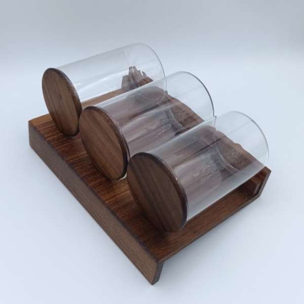 Ceviz ağacının güçlü desenleri ve kaliteli görüntüsü keyfinizi, kullandığınız baharatlar yemeklerinizin lezzetini arttıracaktır. Cam baharat kavanozları baharatlarınızın uzun ömürlü ve sağlıklı kalmalarını sağlar. Cam kavanozların kapakları ceviz ağacından yapılmıştır.