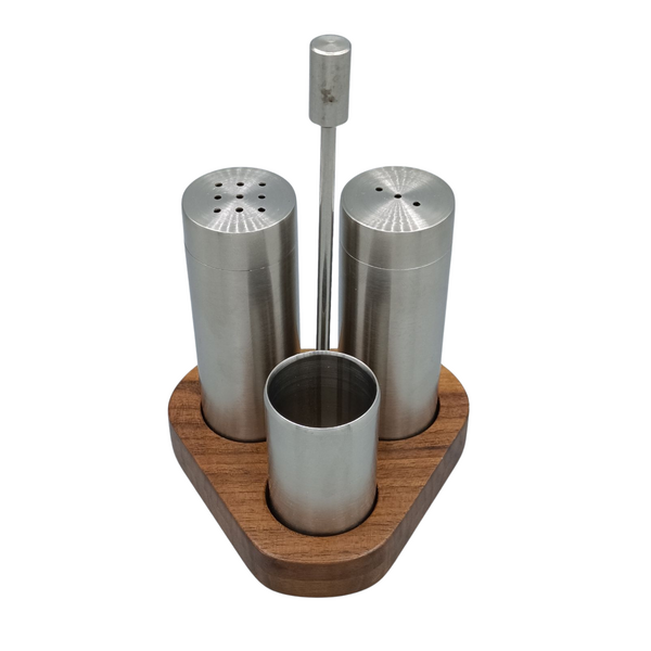 1 adet tuzluk (304 Kalite mat paslanmaz)(Ø:32mm H:90mm) 1 adet karabiberlik (304 Kalite mat paslanmaz)(Ø:32mm H:90mm) 1 adet kürdanlık (304 Kalite mat paslanmaz)(Ø:32mm H:55mm) Doğal zeytinyağı ile korunan ceviz stand(Genişlik: 9,6 cm, En: 9 cm, Yükseklik:15-18 mm) ...Devamını oku