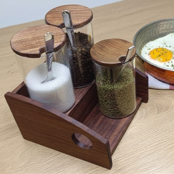 Yeni tezgah üstü baharatlık modelinde, ceviz ağacının eşsiz desenleri kaliteyi en üst seviyede yansıtıyor. Sürekli kullandığınız baharatlar cam kavanoz sayesinde her zaman taze ve elinizin altında olsun. Bu model, 4 kavanoz kapasiteli versiyondur. Bu baharatlığın tasarımına ve ölçüsüne uygun kavanozlar, 250 ml, 200ml veya 150 ml hacimlidir. Tezgah veya masa üstünde kullanabileceğiniz bu baharat seti en üst kalitede işçilik ve tasarım detaylarına sahiptir. Doğal yağ kullanılan ahşap baharatlık, fonksiyonel ve keyifli bir kullanım vadediyor.