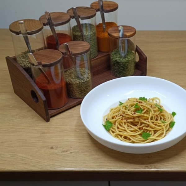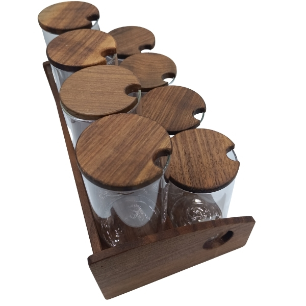 Yeni tezgah üstü baharatlık modelinde, ceviz ağacının eşsiz desenleri kaliteyi en üst seviyede yansıtıyor. Sürekli kullandığınız baharatlar cam kavanoz sayesinde her zaman taze ve elinizin altında olsun. Bu model, 8 kavanoz kapasiteli versiyondur. Bu baharatlığın tasarımına ve ölçüsüne uygun kavanozlar, 250 ml, 200ml veya 150 ml hacimlidir. Tezgah veya masa üstünde kullanabileceğiniz bu baharat seti en üst kalitede işçilik ve tasarım detaylarına sahiptir. Doğal yağ kullanılan ahşap baharatlık, fonksiyonel ve keyifli bir kullanım vadediyor.