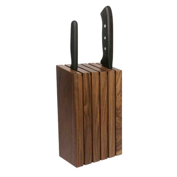 Dekoratif ve Fonksiyonel: Üst kısmına verilen özel açı, bıçak tutuşunu teknik olarak desteklerken aynı zamanda zarif bir görünüm kazandırır. Blok içindeki 3 mm kanal aralıkları, farklı kalınlıktaki bıçakların rahatça yerleştirilmesini sağlar. Büyük döküm demir satırlardan hassas şef bıçaklarına kadar tüm bıçaklar için uygundur.