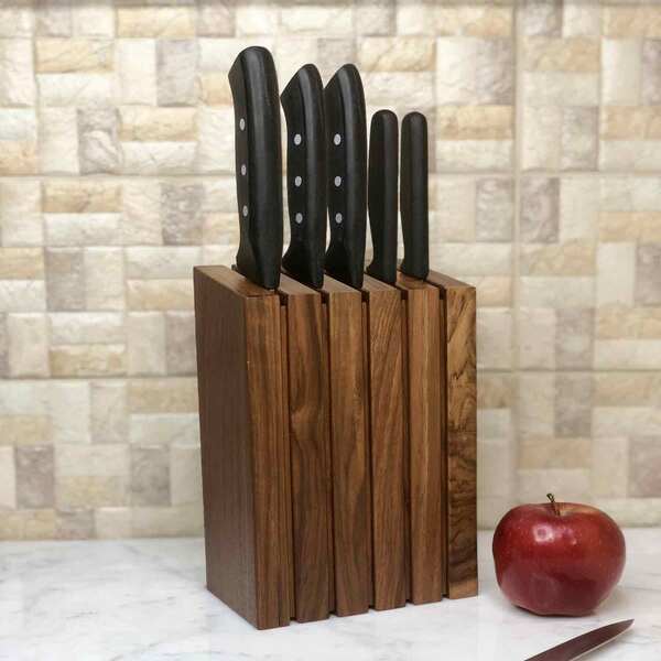 Mıknatıslı Dikey Bıçak Bloğu, 5 bıçak kapasiteli kompakt tasarımıyla mutfak tezgâhlarınızda hem düzen hem de estetik sunar. Birinci sınıf ceviz ağacından üretilen bu model, sıcak rengi ve doğal damar yapısıyla her mutfağa sofistike bir dokunuş katar.