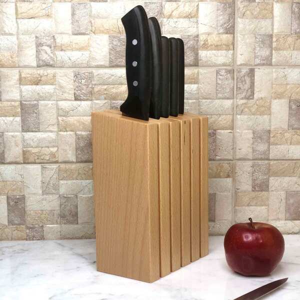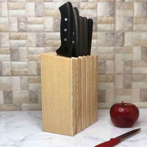 Mıknatıslı Dikey Bıçak Bloğu, 5 bıçak kapasiteli kompakt yapısıyla tezgâh üstü kullanım için idealdir. Açık renkli ve sade dokulu kayın ağacından üretilen bu model, modern mutfaklara hafif ve doğal bir hava kazandırır.