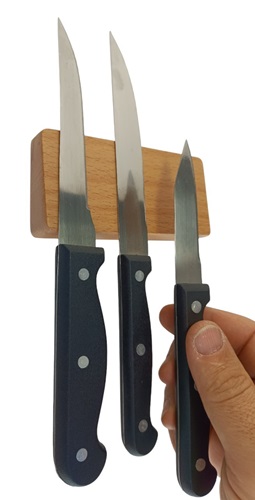Ağaç Türü: Ceviz – Lüks mobilyalarda tercih edilen dayanıklı ve karakterli bir ağaç Cila: Solvent bazlı cila ile korunmuş yüzey Boyut: Genişlik 12 cm x Derinlik 1,5-2,2 cm x Yükseklik 5,5 cm Bıçak Kapasitesi: 3 adet Montaj: Delmeden monte edilir – güçlü çift taraflı bant ürünle birlikte gelir Mıknatıs Özelliği: Neodyum mıknatıs – doğadaki en güçlü mıknatıs türü