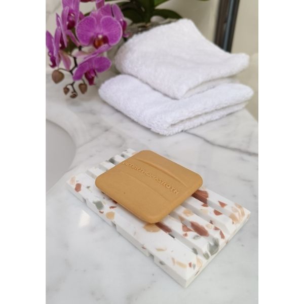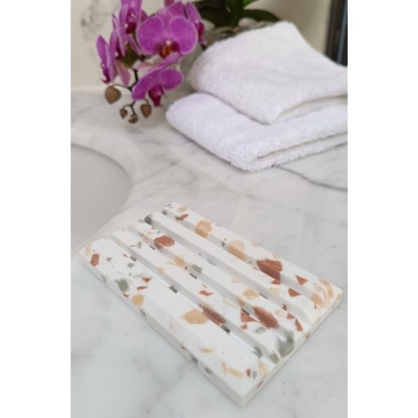 Banyonuzda kaliteyi, hijyeni ve modern şıklığı bir araya getiren beyaz terazzo akrilik sabunluk, dekoratif renk seçenekleriyle banyonuza zarif bir dokunuş katar. Lüks banyo sabunluğu arayanlar için estetik ve fonksiyonelliği buluşturur.