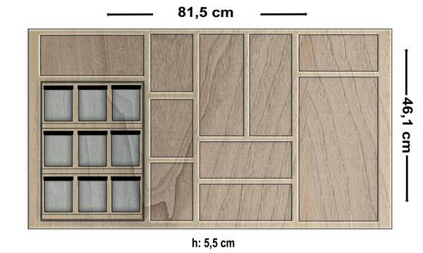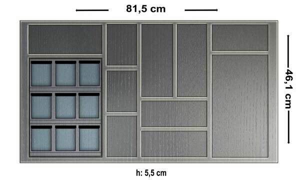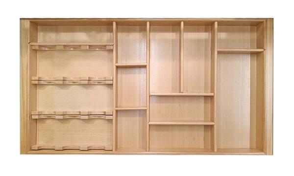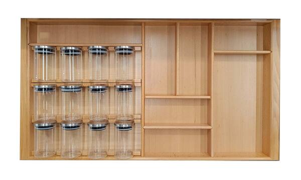Dişbudak ağacından üretilmiş bu özel model, mutfağını hem düzenli hem de şık tutmak isteyen kullanıcılar için tasarlanmıştır. Kaşıklık içine entegre edilen yatık baharat platformu, çekmece içindeki baharat kavanozlarının görünürlüğünü artırır.
