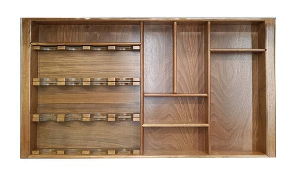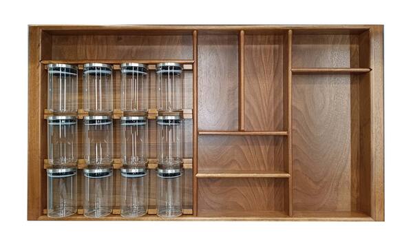 Ceviz ağacının estetik ve dayanıklı dokusunu, akılcı bir mutfak düzeniyle birleştiren bu özel model; çekmece içi kullanım için tasarlanmıştır. Yatık platform bölümü, kaşıklığın içine tam yerleşerek baharat kavanozlarınızı düzenli ve erişilebilir hale getirir.