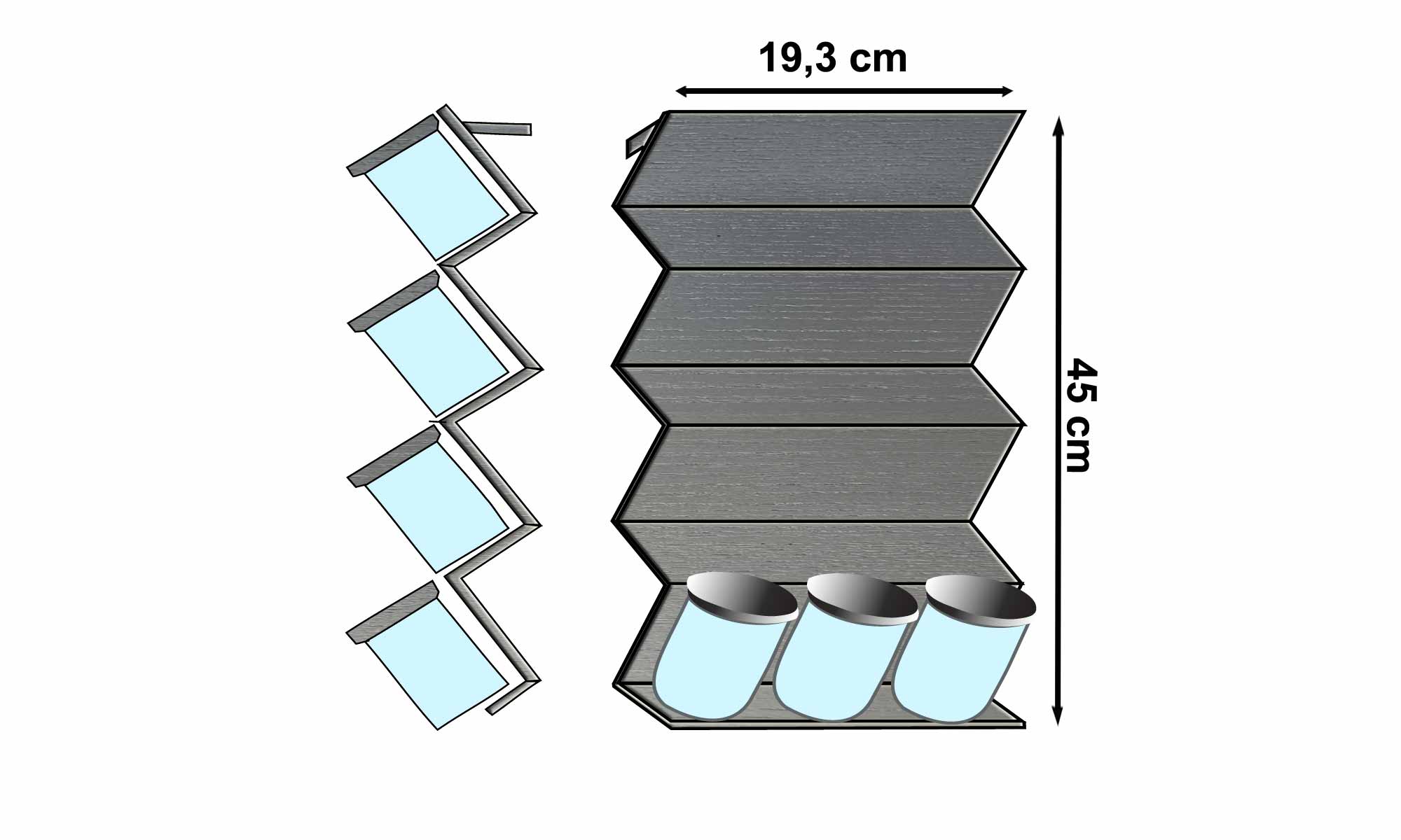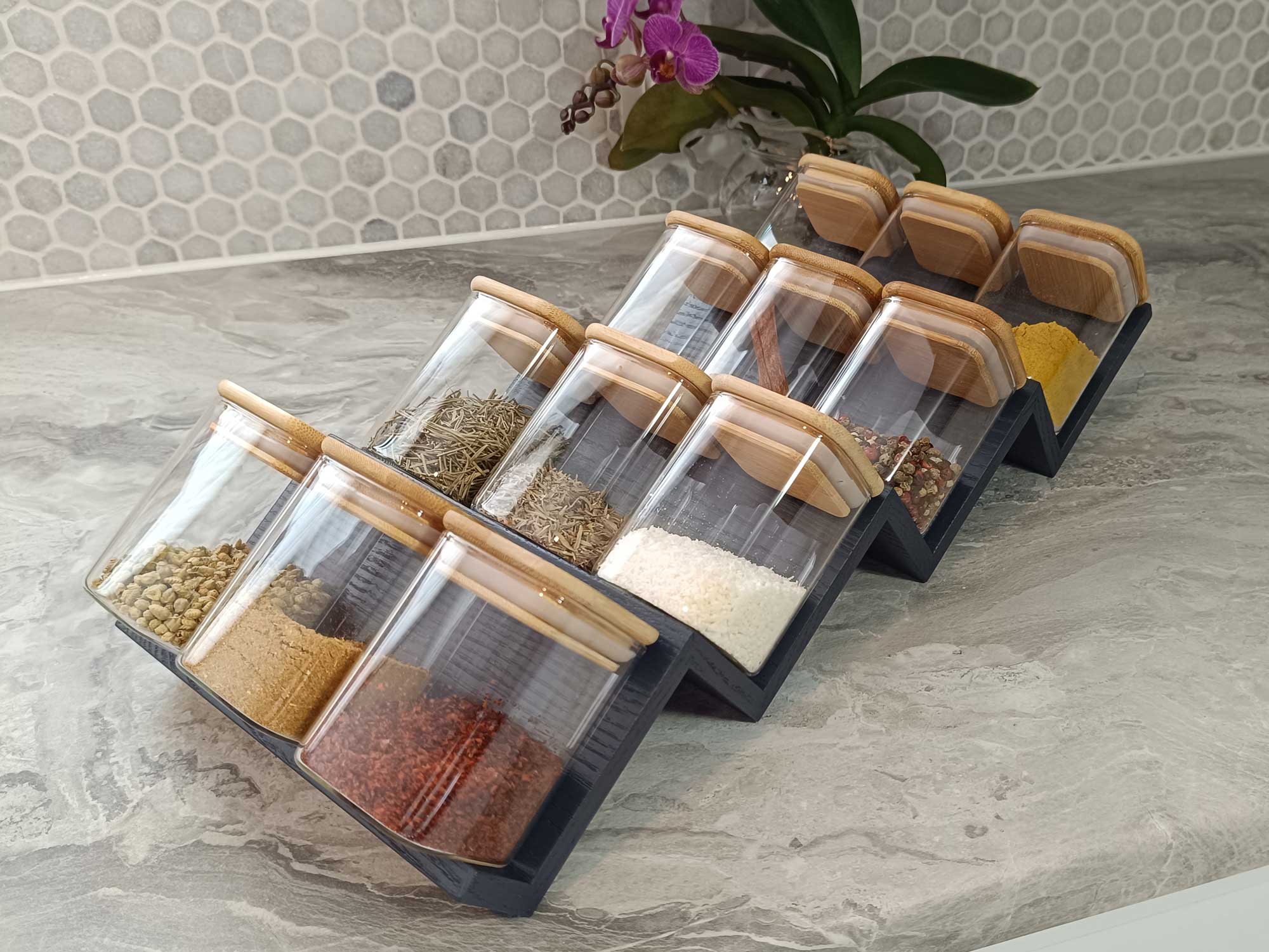 Modern mutfaklara hitap eden bu baharatlık, antrasit boyalı dişbudak ağacından üretilmiştir. Ağacın damarları özel bir teknikle belirginleştirilmiş ve antrasit boya ile şık bir kontrast yaratılmıştır. 12 adet baharat kapasiteli merdiven basamaklı platform tasarımı, fonksiyonel olduğu kadar dekoratif bir çözüm sunar.