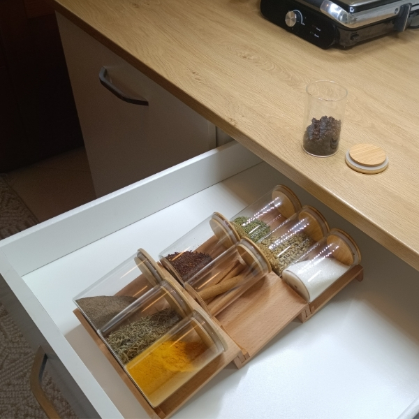 Kayın ağacının doğal dokuları ve estetik görünümü sayesinde, kullandığınız baharatlar yemeklerinizin lezzetini arttıracaktır. Cam baharat kavanozları baharatlarınızın uzun ömürlü ve sağlıklı kalmalarını sağlar. Cam kavanozların kapakları kayın ağacından yapılmıştır. Kavanozlar modülün fiyatına dahildir.