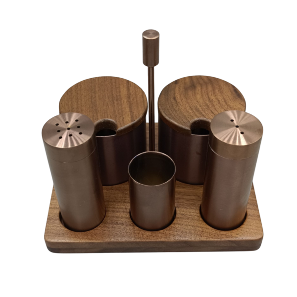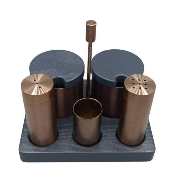 5'li Restoran Baharatlık içeriği; 1 adet tuzluk (PVD Bakır Kaplama, 304 Kalite mat paslanmaz)(Ø:32mm H:90mm) 1 adet karabiberlik (PVD Bakır Kaplama, 304 Kalite mat paslanmaz)(Ø:32mm H:90mm) 1 adet kürdanlık (PVD Bakır Kaplama, 304 Kalite mat paslanmaz)(Ø:32mm H:55mm) 2 adet ahşap kapaklı şeker ...Devamını oku