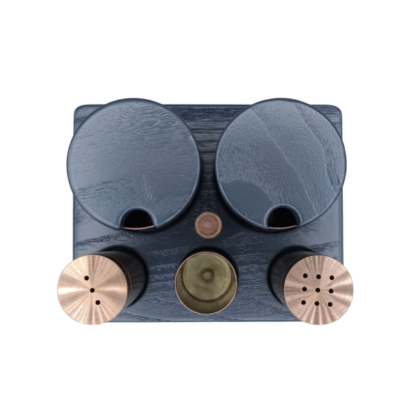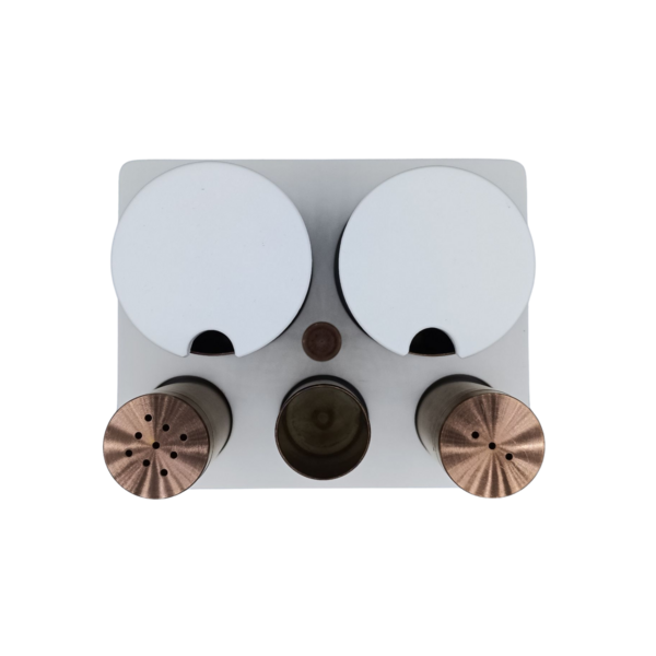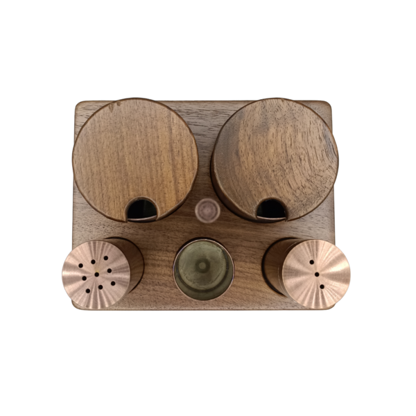 4. 2 adet ahşap kapaklı şekerlik (PVD Bakır Kaplama, 430 Kalite mat paslanmaz)(Ø:60mm H:60mm)