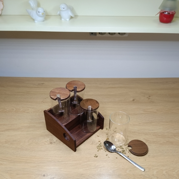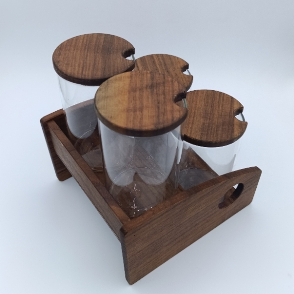 Yeni tezgah üstü baharatlık modelinde, ceviz ağacının eşsiz desenleri kaliteyi en üst seviyede yansıtıyor. Sürekli kullandığınız baharatlar cam kavanoz sayesinde her zaman taze ve elinizin altında olsun. Bu model, 4 kavanoz kapasiteli versiyondur. Bu baharatlığın tasarımına ve ölçüsüne uygun kavanozlar, 250 ml, 200ml veya 150 ml hacimlidir. Tezgah veya masa üstünde kullanabileceğiniz bu baharat seti en üst kalitede işçilik ve tasarım detaylarına sahiptir. Doğal yağ kullanılan ahşap baharatlık, fonksiyonel ve keyifli bir kullanım vadediyor.