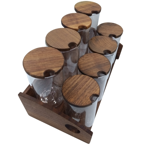 Yeni tezgah üstü baharatlık modelinde, ceviz ağacının eşsiz desenleri kaliteyi en üst seviyede yansıtıyor. Sürekli kullandığınız baharatlar cam kavanoz sayesinde her zaman taze ve elinizin altında olsun. Bu model, 8 kavanoz kapasiteli versiyondur. Bu baharatlığın tasarımına ve ölçüsüne uygun kavanozlar, 250 ml, 200ml veya 150 ml hacimlidir. Tezgah veya masa üstünde kullanabileceğiniz bu baharat seti en üst kalitede işçilik ve tasarım detaylarına sahiptir. Doğal yağ kullanılan ahşap baharatlık, fonksiyonel ve keyifli bir kullanım vadediyor.