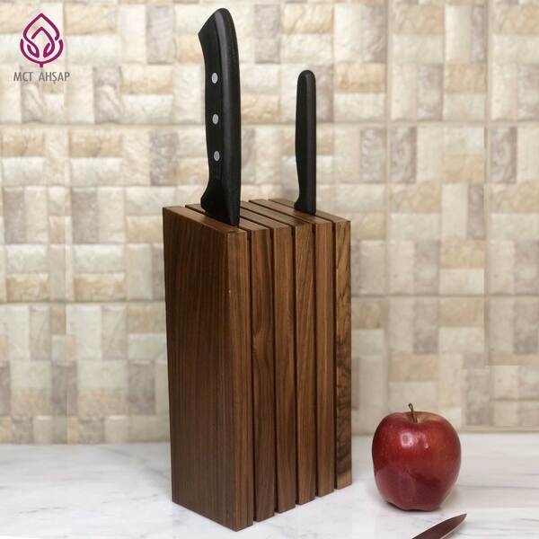Mıkantıslı Dikey Bıçak Bloğu, 5 bıçak kapasiteli kompakt tasarımıyla mutfak tezgâhlarınızda hem düzen hem de estetik sunar. Birinci sınıf ceviz ağacından üretilen bu model, sıcak rengi ve doğal damar yapısıyla her mutfağa sofistike bir dokunuş katar.