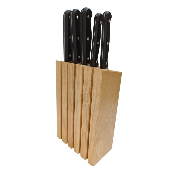 Mıknatıslı Dikey Bıçak Bloğu, 5 bıçak kapasiteli kompakt yapısıyla tezgâh üstü kullanım için idealdir. Açık renkli ve sade dokulu kayın ağacından üretilen bu model, modern mutfaklara hafif ve doğal bir hava kazandırır.