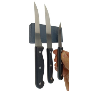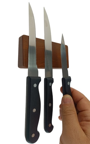 Ağaç Türü: Ceviz – Lüks mobilyalarda tercih edilen dayanıklı ve karakterli bir ağaç Cila: Solvent bazlı cila ile korunmuş yüzey Boyut: Genişlik 12 cm x Derinlik 1,5-2,2 cm x Yükseklik 5,5 cm Bıçak Kapasitesi: 3 adet Montaj: Delmeden monte edilir – güçlü çift taraflı bant ürünle birlikte gelir Mıknatıs Özelliği: Neodyum mıknatıs – doğadaki en güçlü mıknatıs türü